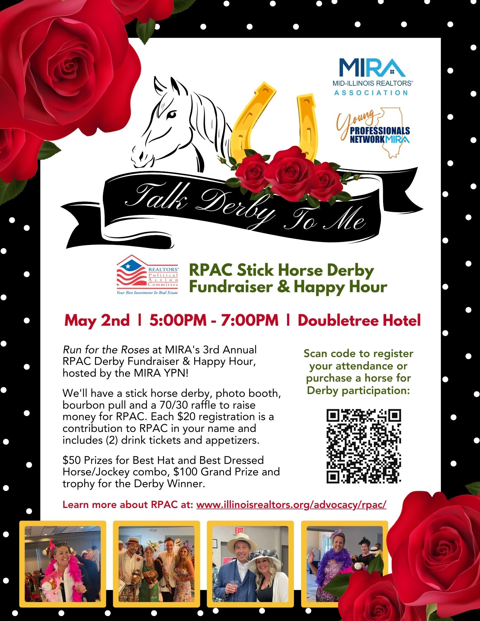 Run for the Roses at MIRA's 2nd Annual RPAC Derby Fundraiser & Happy Hour, hosted by MIRA YPN! We'll have a stick horse derby, bourbon pull and 70/30 raffle to raise money for RPAC. Each $20 registration is a contribution to RPAC and includes (2) drink tickets and appetizers. $50 Prizes for Best Hat and Best Dressed Horse/Jockey combo, $100 Grand Prize and trophy for the Derby Winner. Learn more about RPAC at: www.illinoisrealtors.org/advocacy/rpac/.