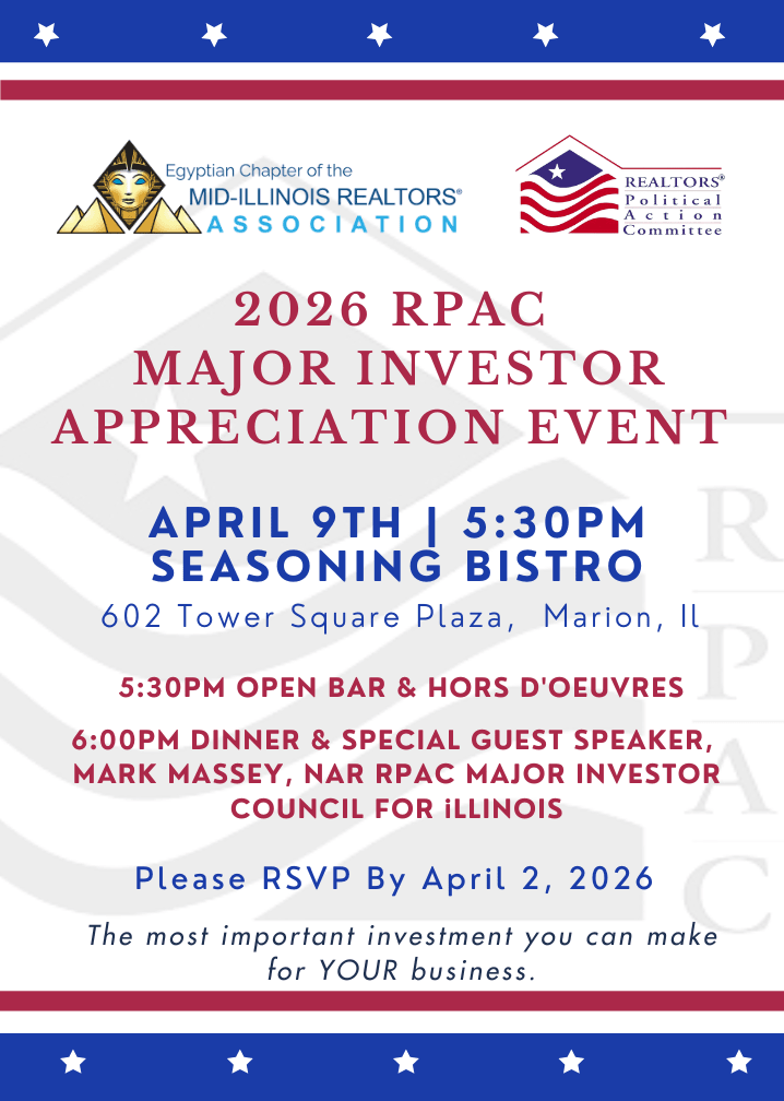 RPAC Major Investors—this celebration is for you! Join us for an exclusive, invite‑only gathering honoring our valued RPAC Major Investors. We’re excited to welcome guest speaker Mark Massey, NAR RPAC Major Investor Council for Illinois, who will share insights into how your RPAC investment strengthens our local real estate industry. You’ll also hear from IR, MIRA and Egyptian Chapter Representatives about the unique benefits of becoming a Major Investor and the impact your leadership has within our profession. We look forward to celebrating your commitment and contributions!