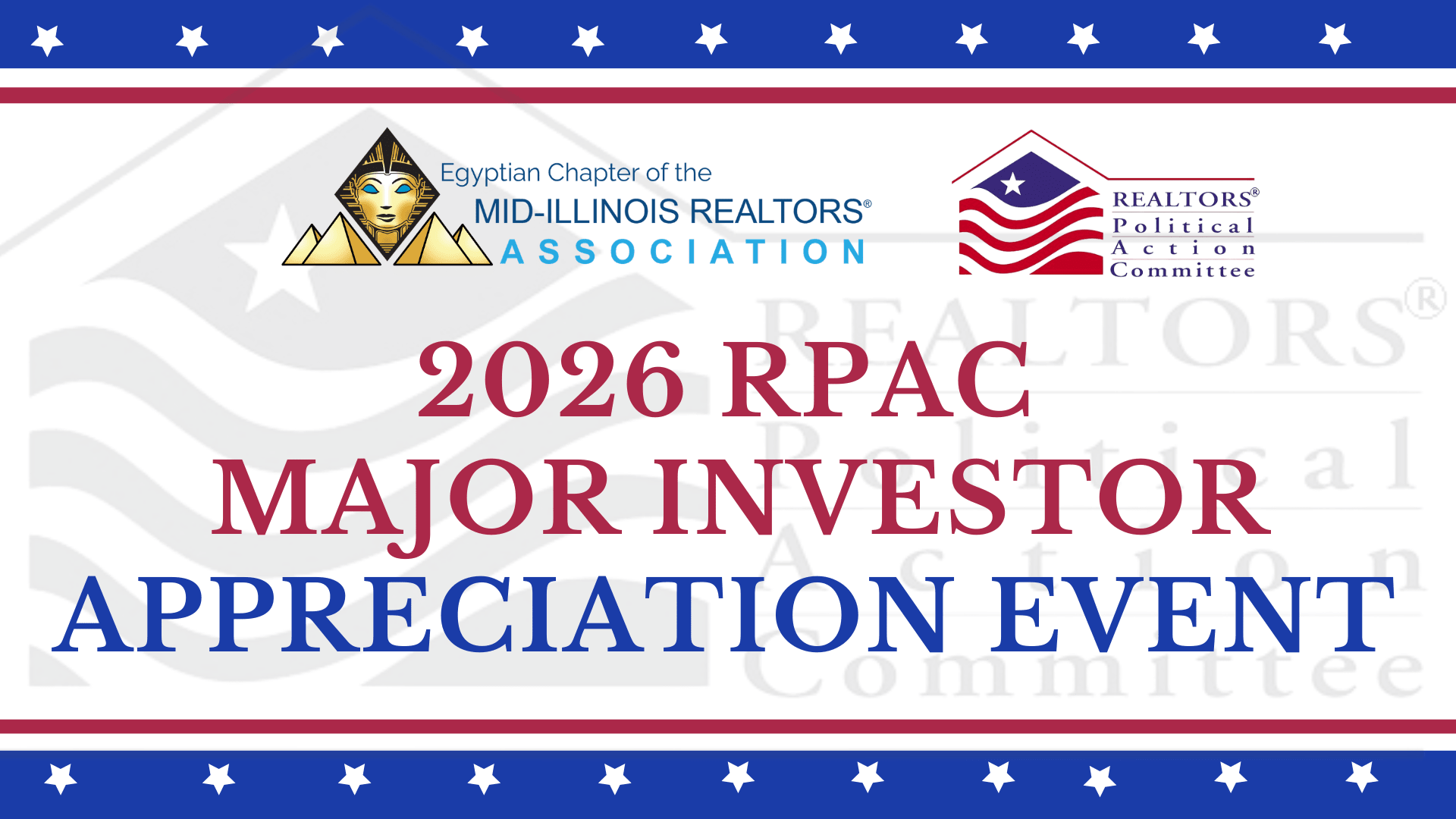 RPAC Major Investors—this celebration is for you! Join us for an exclusive, invite‑only gathering honoring our valued RPAC Major Investors. We’re excited to welcome guest speaker Mark Massey, a distinguished 3‑Star RPAC Hall of Famer, who will share insights into how your RPAC investment strengthens our local real estate industry. You’ll also hear about the unique benefits of becoming a Major Investor and the impact your leadership has within our profession. We look forward to celebrating your commitment and contributions!